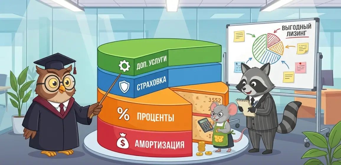 Платёж по лизингу — это не просто "цена машины делённая на месяцы". Туда входит возмещение стоимости самого имущества, вознаграждение лизинговой компании за услугу, плюс всякие дополнительные опции (если подключали), и, конечно, НДС сверху.
